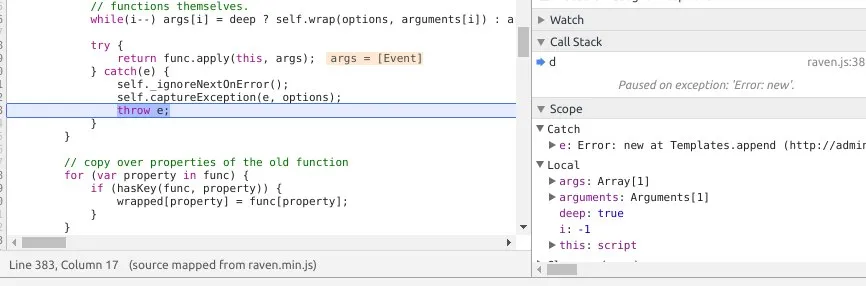 делаю Raven.install(), ошибки уходят, но в браузере теряются стек-фреймы в дебаггере :(