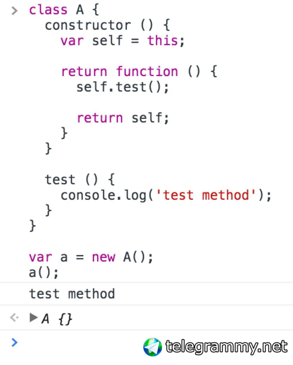 https://babeljs.io/repl/#?babili=false&evaluate=true&lineWrap=false&presets=es2015%2Ces2015-loose%2Cstage-1%2Cstage-2%2Cstage-3&experimental=true&loose=true&spec=true&code=class%20A%20%7B%0A%20%20constructor%20()%20%7B%0A%20%20%20%20return%20(function%20()%20%7B%20%0A%20%20%20%20%20%20this.test()%3B%0A%20%20%20%20%20%20return%20this%3B%0A%20%20%20%20%7D).bind(this)%3B%0A%20%20%7D%0A%20%20%0A%20%20test%20()%20%7B%0A%20%20%20%20console.log(1)%3B%0A%20%20%7D%0A%7D%0A%0Avar%20test%20%3D%20new%20A()()%3B%0Aconsole.log(test)%3B