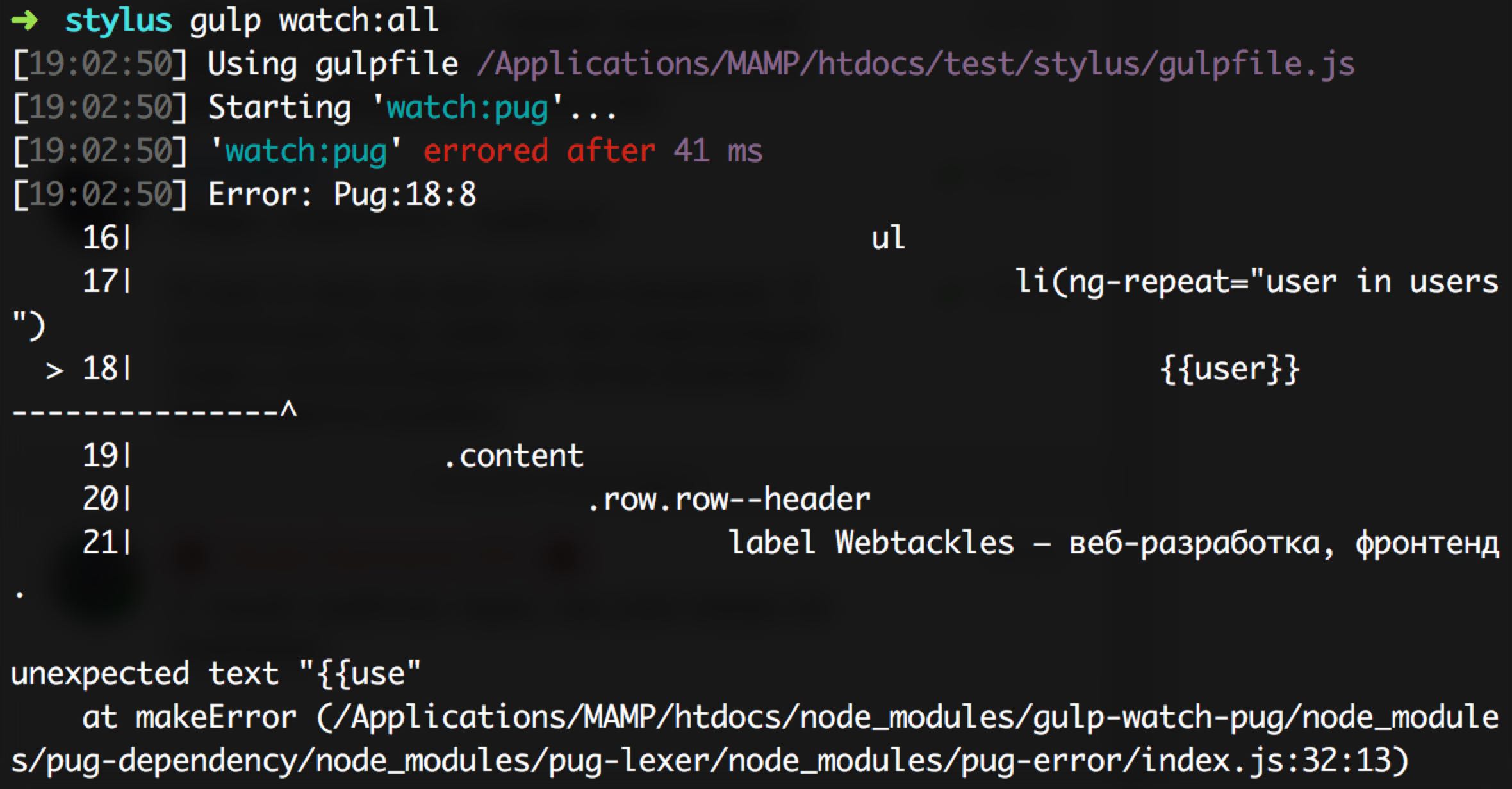 Я уже 3 часа не могу найти решение. Я использую Pug (Jade) и при компиляции кода с использованием тегов {{name}} возникается ошибка
