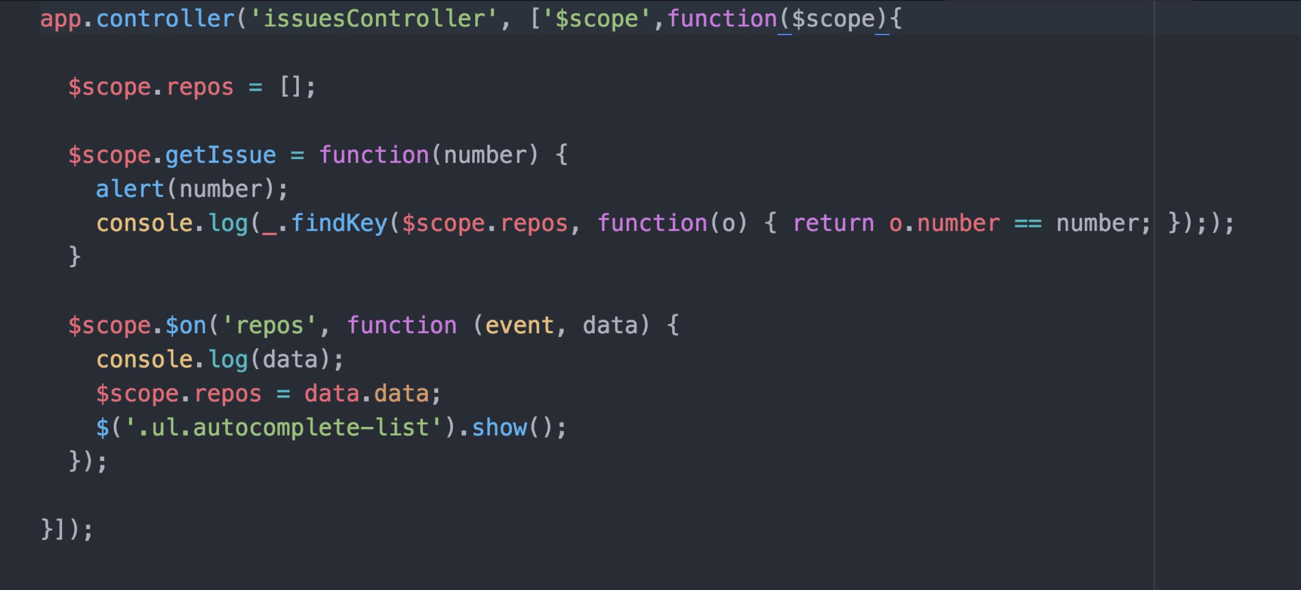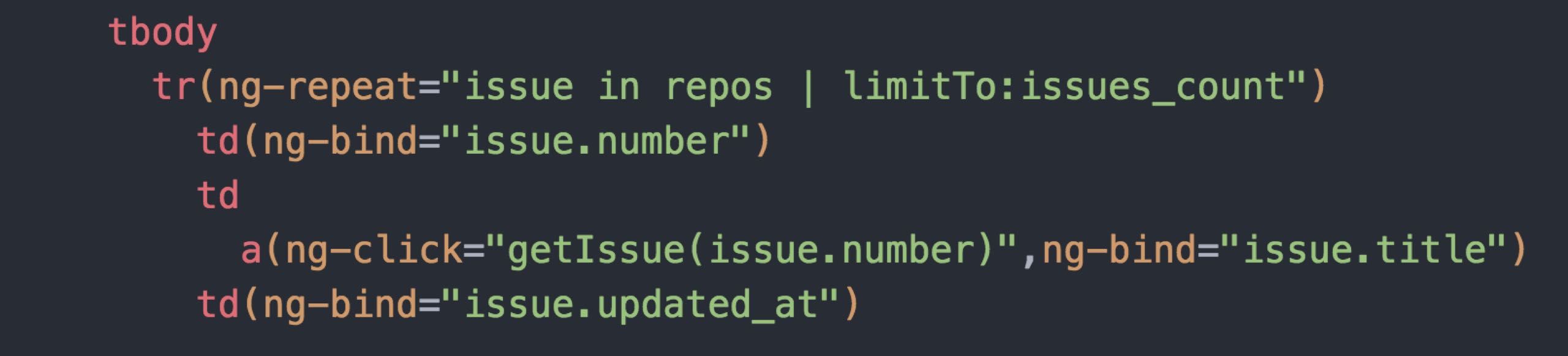 @archakov06 ng-repeat создает отдельный скоуп, и при клике в нем ищется getIssue (а не в скоупе контроллера), но его там нет. $parent.getIssue будет работать, но это так себе решение.