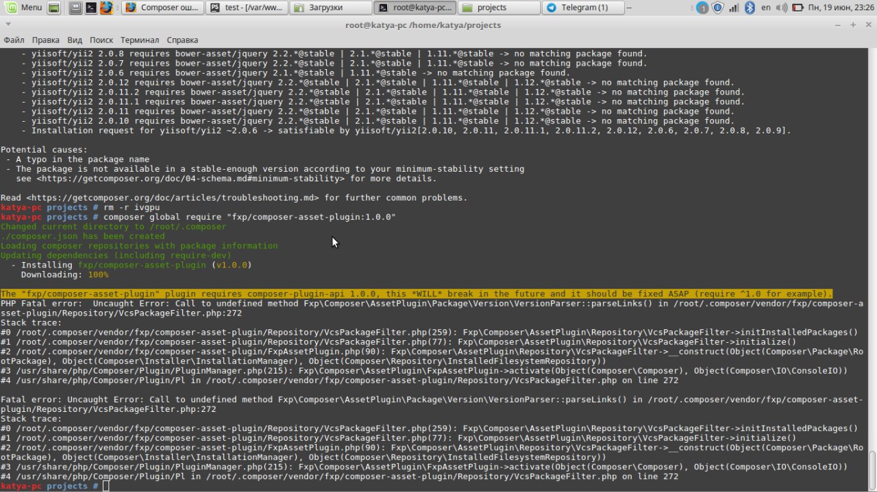 на команду composer global require "fxp/composer-asset-plugin:1.0.0" Отвечает этой ошибкой(