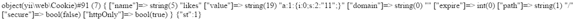 object(yii\web\CookieCollection)#62 (2) { ["readOnly"]=> bool(false) ["_cookies":"yii\web\CookieCollection":private]=> array(1) { ["likes"]=> object(yii\web\Cookie)#90 (7) { ["name"]=> string(5) "likes" ["value"]=> string(19) "a:1:{i:0;s:2:"12";}" ["domain"]=> string(0) "" ["expire"]=> int(0) ["path"]=> string(1) "/" ["secure"]=> bool(false) ["httpOnly"]=> bool(true) } } }