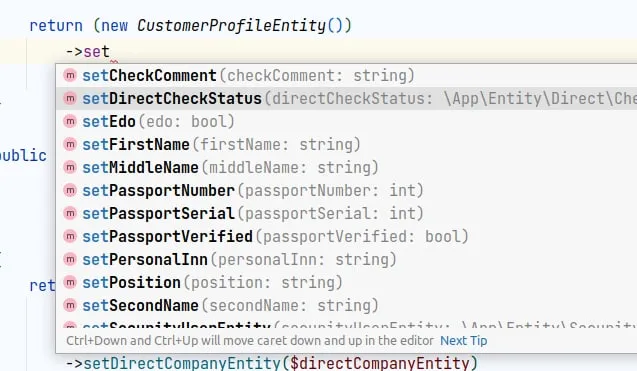 Всем привет! Извините, возможно оффтоп, у меня вопрос по phpstorm. При заполнении объекта, бывает нужно выбрать большое кол-во сеттеров. Я выбираю их из списка по одному, если сеттеров много, то можно пропустить парочку и приходится сверяться с общим списком - короче это не удобно. Может быть есть способ как выбрать все сеттеры сразу или выделить нужные? Расскажите как решаете эту проблему?