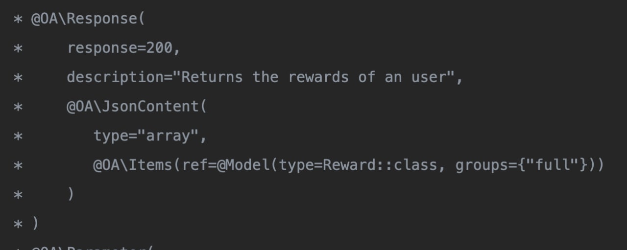 А собственно и не надо примеров - все на сайте есть https://symfony.com/bundles/NelmioApiDocBundle/current/index.html