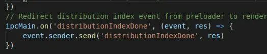 Так чтобы отправить что то в рендерер, должно сначала прийти событие distributionIndexDone. Вопрос не связан с обсуждением выше, это просто с чем недавно столкнулся