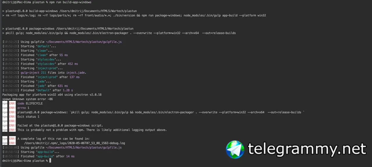 подскажите плз, делаю билд на маке для linux с помощью вот такой команды npm run build-app-linux и все ок, и хотел бы сделать для windows но падает, кто может подсказать почему?