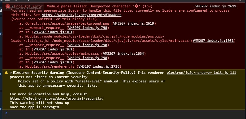 Я использую electron-forge который идет с webpack темплейтом. И у меня появилась небольшая проблема с картинками и другими файлами, которые определяются в scss/сss файлах, но решение ошибки я так и не нашел. Кто подскажет в чем может быть проблема?