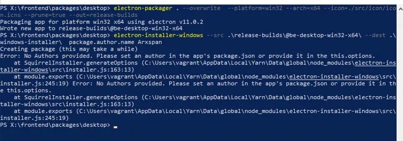 Привет. Подмиогните советом. Пытаюсь собрать установщик, перед этим успешно собрал пакет. Поле "authors" в package.json уже добавил согласно полученной ошибке и пересобрал. Всем заранее спасибо!