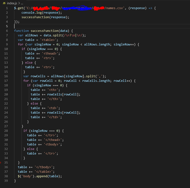 Вопросик.❓ Вот код для создания таблицы из csv файла. И код, и файл лежат на ПК.(Всё как будет в электроне) Файл вытаскиваю через $.get. (Код на JS+jquery 3.6.0). Выдаёт ошибку о том что нельзя сайтам через браузер брать файлы клиента. (Access to XMLHttpRequest at 'file:///...../names.csv' from origin 'null' has been blocked by CORS policy: Cross origin requests are only supported for protocol schemes: http, data, chrome, chrome-extension, brave, chrome-untrusted, https.) Но у меня ПК используется сам как сервер :) :) Таким образом браузер файлам с сервера запрещает доступ к другим файлам сервера. Можно попробовать open server, но на электроне то его не будет!! Как это реализуют? Что делать???? Фото с кодом js прикрепил.