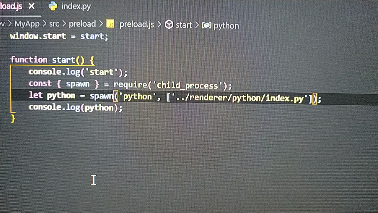Работаю с electron js и хочу запускать скрипт python, с помощью child_process, к сожалению не получаю нужной мне реакции, если кто нибудь работал или представляет о чем я, буду благодарен за отзывчивость .