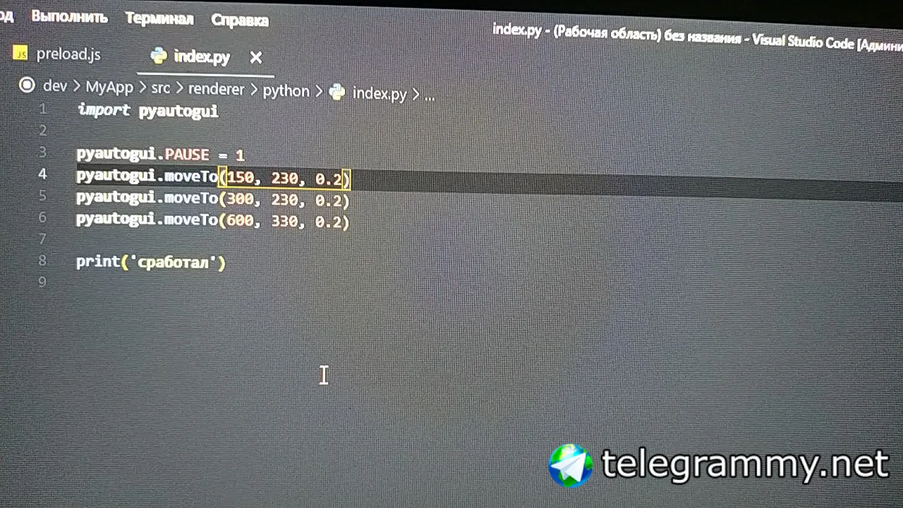 Опишу задачу коротко, есть электрон приложение, там кнопка старт, я на нее нажимаю и с помощью python пакета pyautogui курсор двигается по нужным координатам.