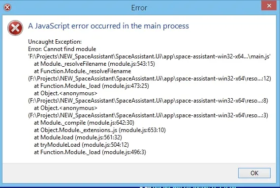 всем привет ,в чем может быть проблема - у меня electron=packager, у меня приложение собирается ок, а у другого человека который собирает проект тоже собирается, но выпадает ошибка при попытке запуска приложения