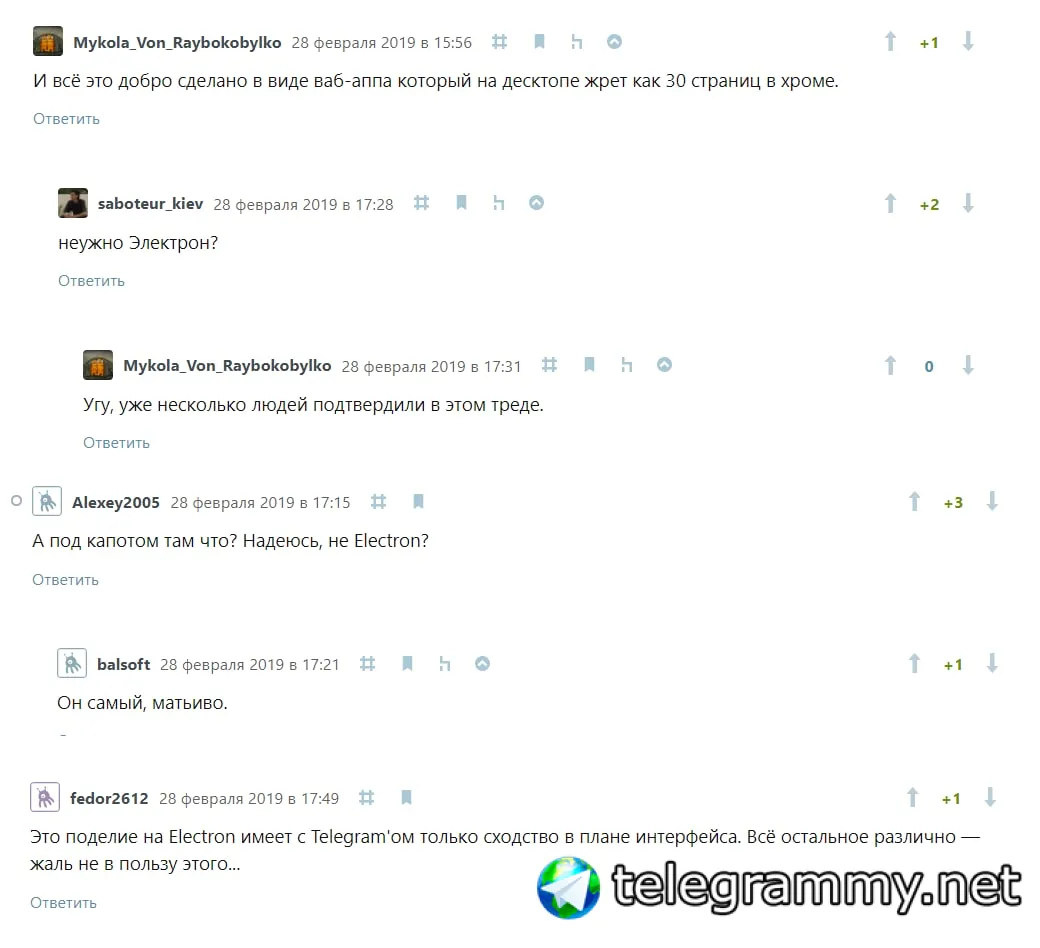 ТГ супер потому что очень крутые функции реализовывают одними из первых. Никто не спорил никогда, что Electron может обойти нативные приложения по производительности. Но Electron отлично подходит для MVP и старта проекта, когда не понятно, выстрелит идея или нет. Потому что тайм ту маркет значительно меньше.