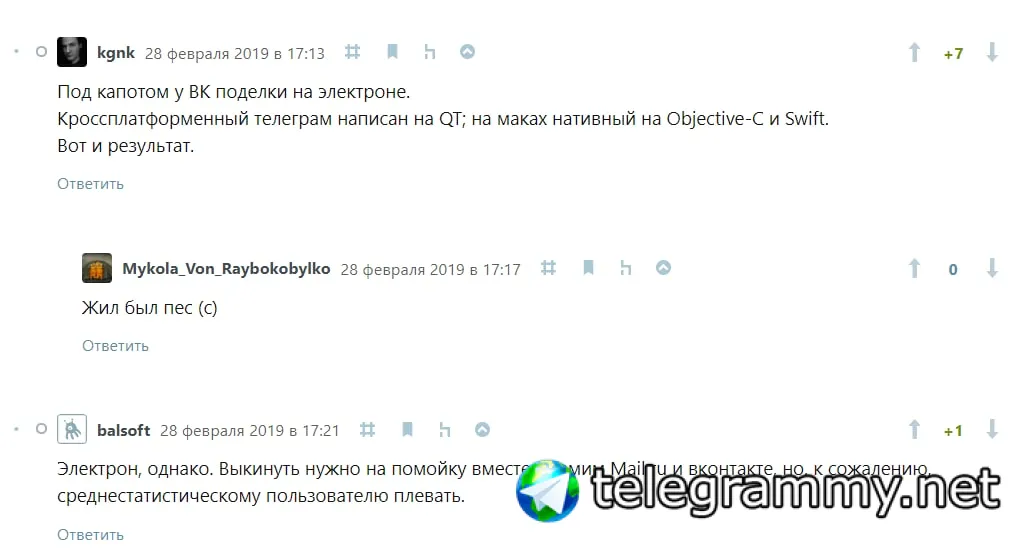 Разница только в том, что для разработки приложения телеграма ебались с Qt, свифтом и прочим, а ВК сбабахали на электроне, а работает точно так же)