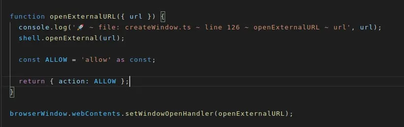 Ребят, как сделать чтобы при клике на ссылку с атрибутом mailto: или tel: то он открывал системное приложение, нашел решение как на скрине, но оно не работает, нажимаю на ссылку и приложение просто вылетает, вероятно это происходит потому что електрон пытается через себя открыть нужное приложение