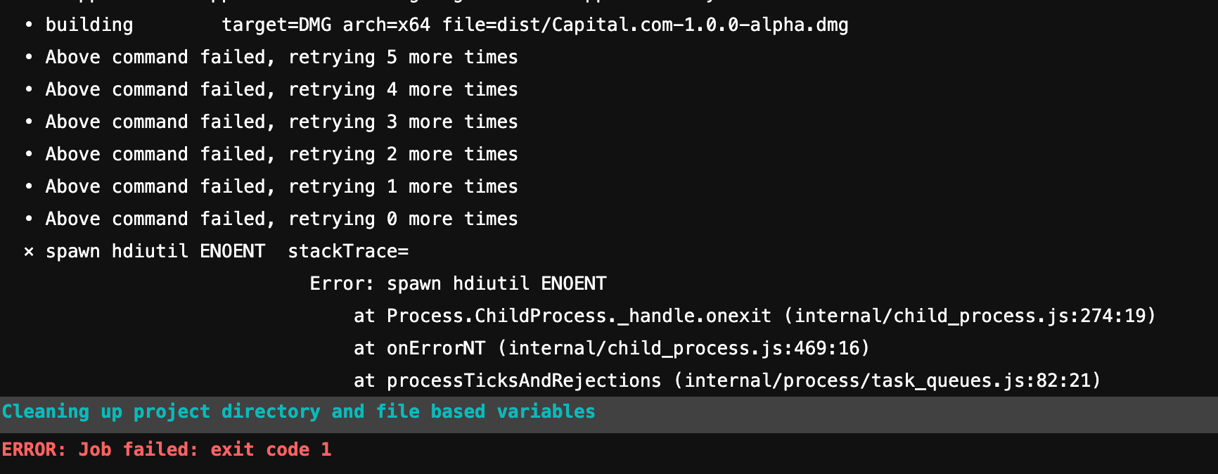 Поправил версию билдера, та же ошибка, удалил для нее dmg-license, билд падает с новой:
