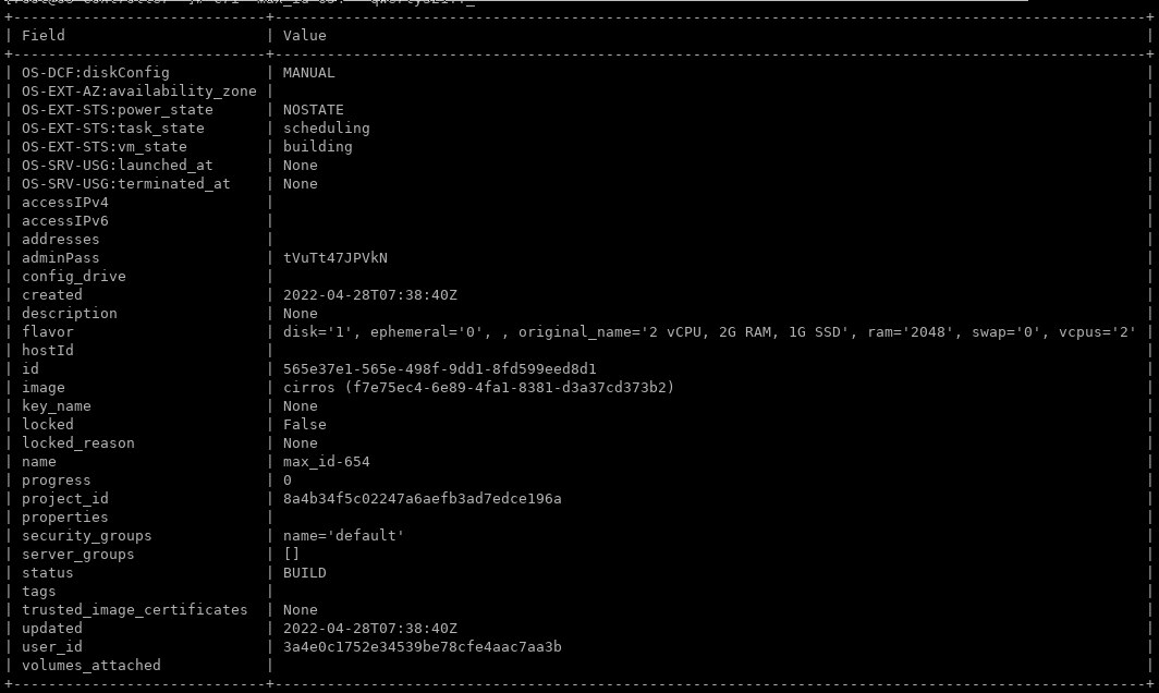 openstack --os-compute-api-version 2.74 server create --image "cirros" --flavor '2 vCPU, 2G RAM, 1G SSD' --network provider max_id-654