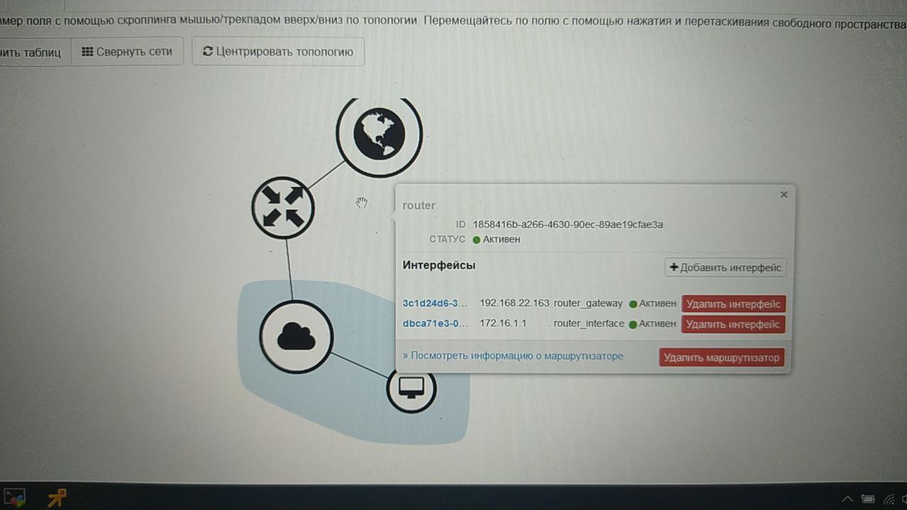 Сценарий установки отрабатывает успешно, контейнеры запущены, router и подсети созданы и подключены, инстанс запускается, но вот доступа во внешний мир нет... ip-адрес роутера не пингуется (хотя его mac виден вообще с другой vm в этой сети) и с инстанса трафик дальше роутера не проходит...