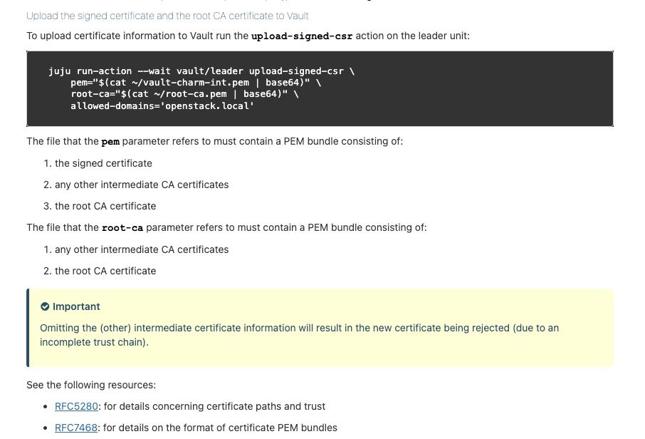 juju config openstack-dashboard ssl_ca="$(cat root.crt|base64)" ssl_cert="$(cat site.crt|base64)" ssl_key="$(cat site.key|base64)"