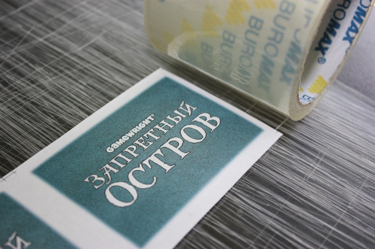 потом ламинируем с двух сторон скотсем 72 мм шириной, прекрывает среднестатистический размер карт