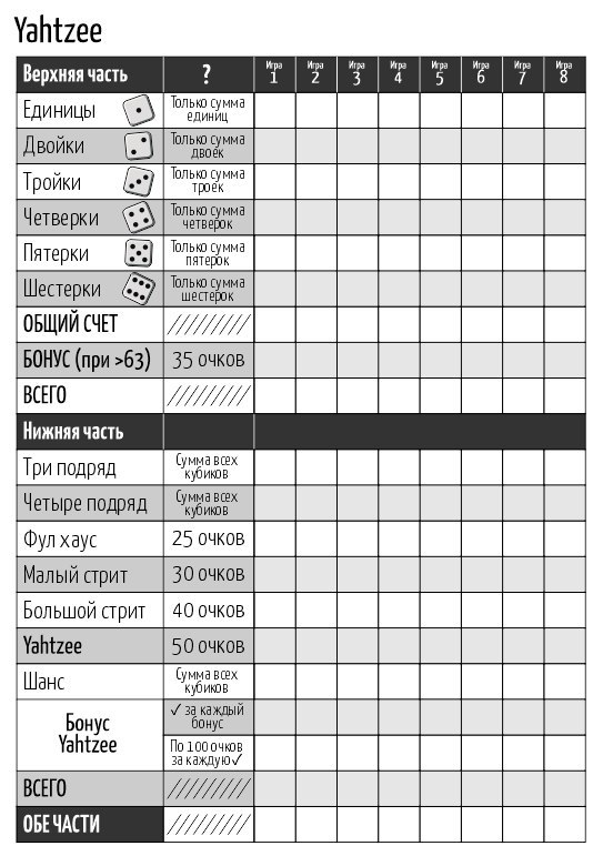 Да, я тоде такой вариант знаю. Но считается не сумма одинаковых костей в верхней половине таблице, а если три кости, то выходишь в ноль очков, а если больше или меньше, то в плюс или в минус. Три пятёрки, например, — 0 очков, четыре пятёрки — 5, пять пятёрок — 10. Две пятёрки — –5, одна — –10, ни одной — –15. То есть можно и вминусить неплохо в первой половине, если не повезёт. Но неудачи можно "обозвать" единицами и получить –3 вместо –15, например, если единички ещё свободны.