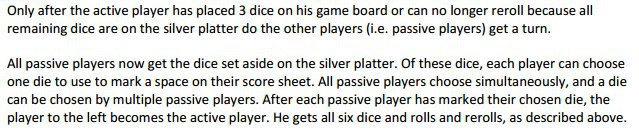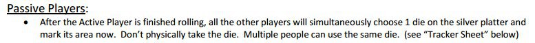 Примечание: если после броска активный не может выполнить ни одно действие, он просто ничего не делает и делает второй бросок, а если пассив не может применить ничего из того, что в тарелке — может выбрать куб с планшетки игрока.