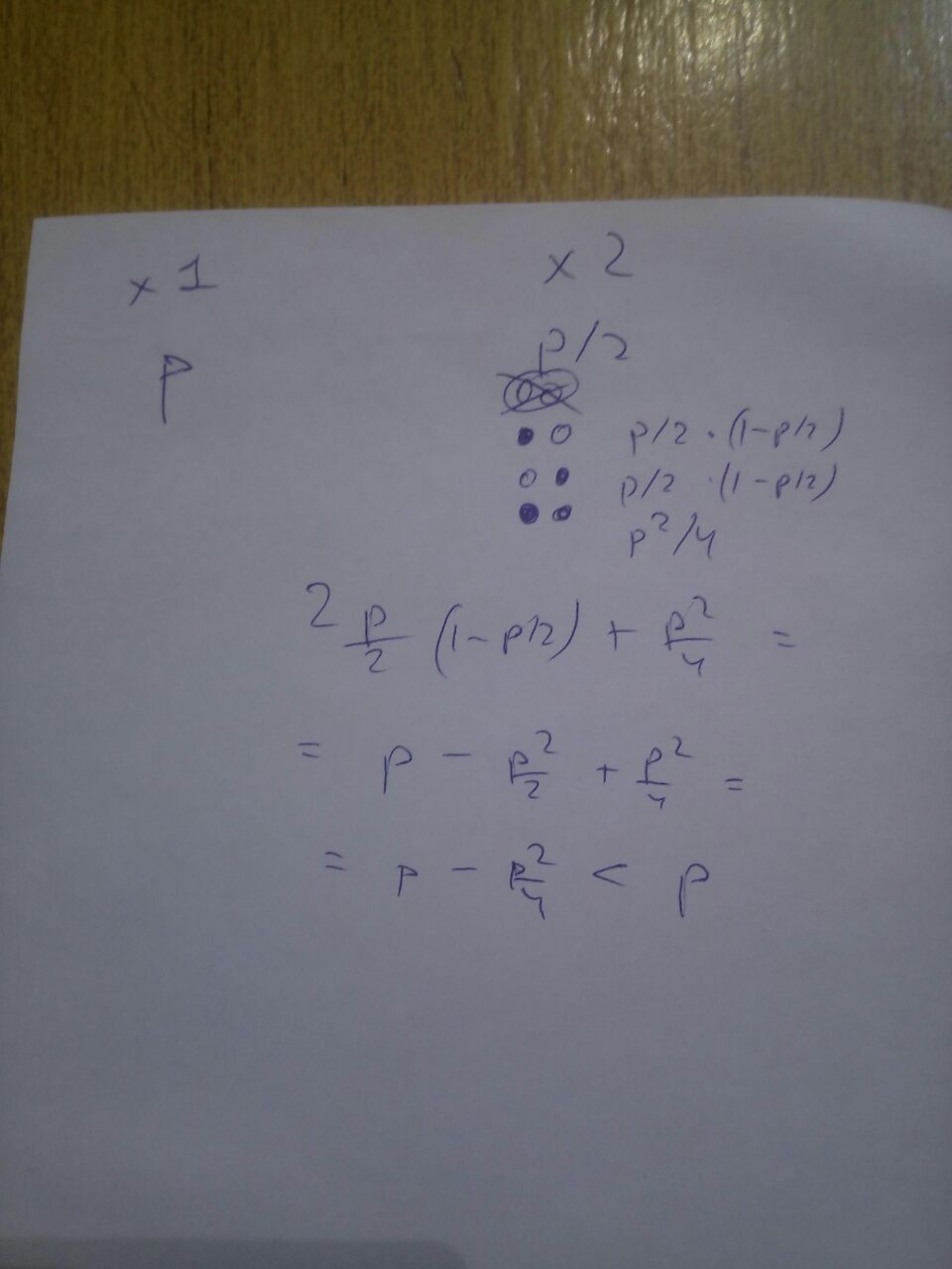 "Нам надо взорвать стену. Что лучше - купить 1 бомбу, вероятность взрыва которого равна p, или две, вероятность которых p/2"?
