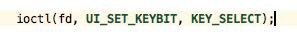 Попробуй ioctl(fd, UI_SET_BIT, KEY_SELECT);