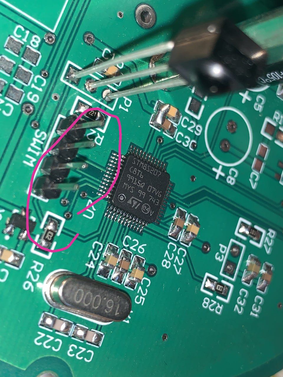 Между программатором и микросхемой должен быть посредник, ибо напрямую к ножкам микросхемы программатор не подключить. Эта вещь называется отладочная плата, ее можно купить там же, где и сам программатор. Отладочная плата уже содержит сам микроконтроллер, всю обвязку достаточно подключить проводами ее к программатору и можно прошивать. Для поиска на алиэкспресс достаточно ввести название чипа микроконтроллера, например " STM8S003F3P6 " Помимо самих микросхем в поиске будут выпадать и отладочные платы на них.