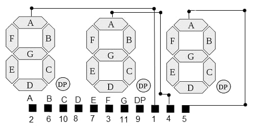 Если подать например плюс одновременно на 1,2,3 и минус через резистор на А, то загорится один одинаковый сегмент на всех трёх знакоместах