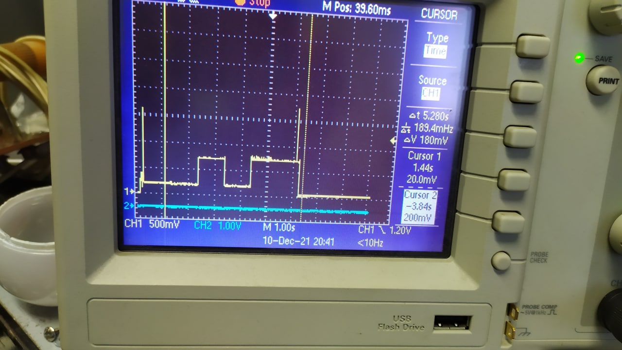 Нате вам ESP от рассвета до заката...точнее, потребление тока от ресета до дипслипа... с неведомой херью после ресета (первый пичок слева) на уровне 150-180 ма при передаче (последний пичок)