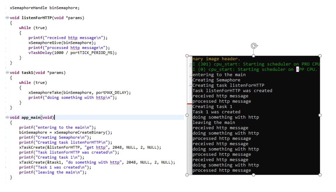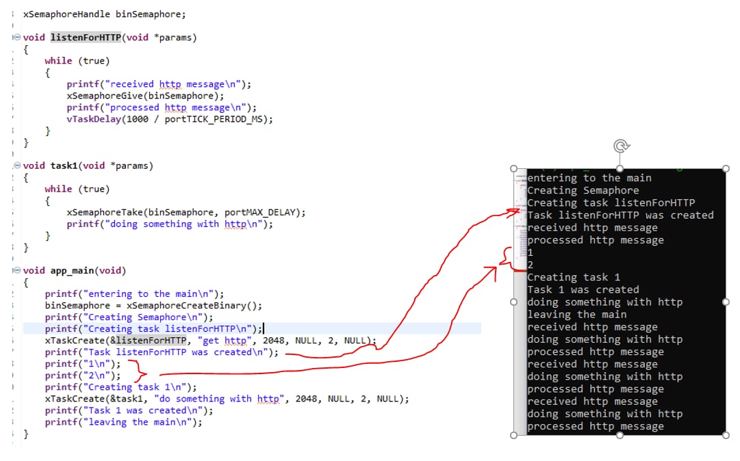 интересно, если изменить код и добавить после printf("Task listenForHTTP was created\n"); еще пару команд, то они уже будут выполняться после listenForHTTP. Это означает типа нужно время для планировщика, чтобы он смог добавить задачу в ready state?