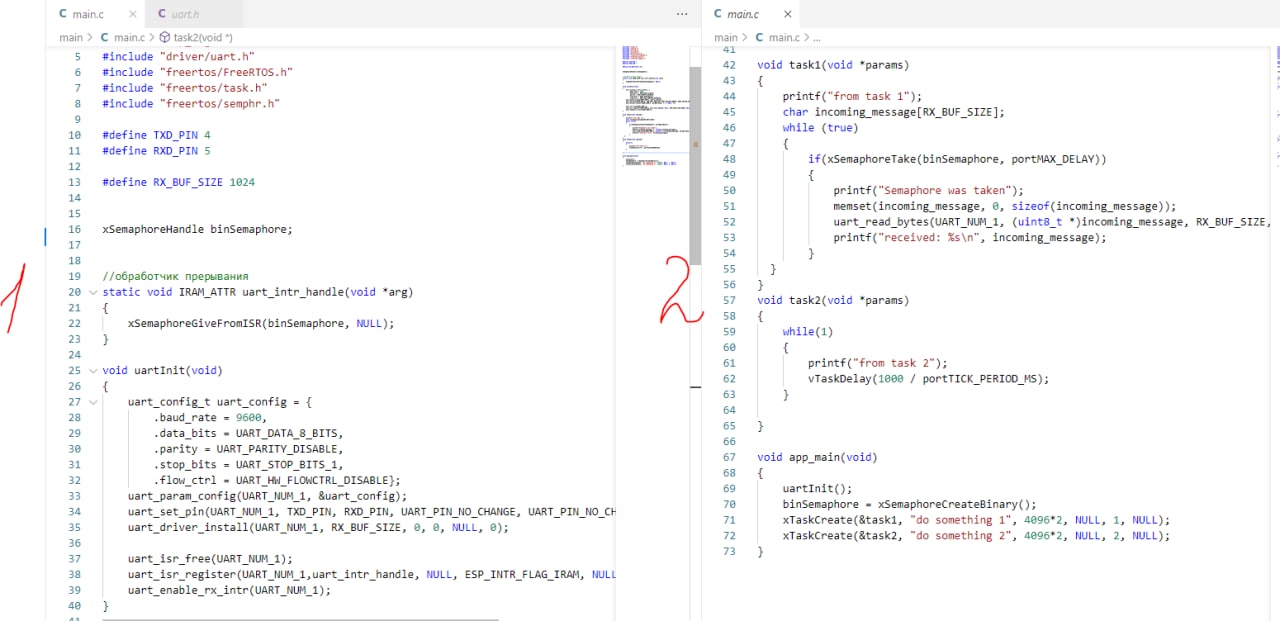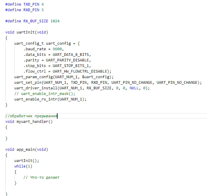 Всем привет. Есть кто на esp-idf работал с uartом с помощью прерываний? Задача такая: в основном цикле что-то периодически делается, при поступлении через uart данных вызывается прерывания и в ISR нужно отдать семафор. Но пока у меня не получается это сделать. Буду благодарен советам, ссылкам...