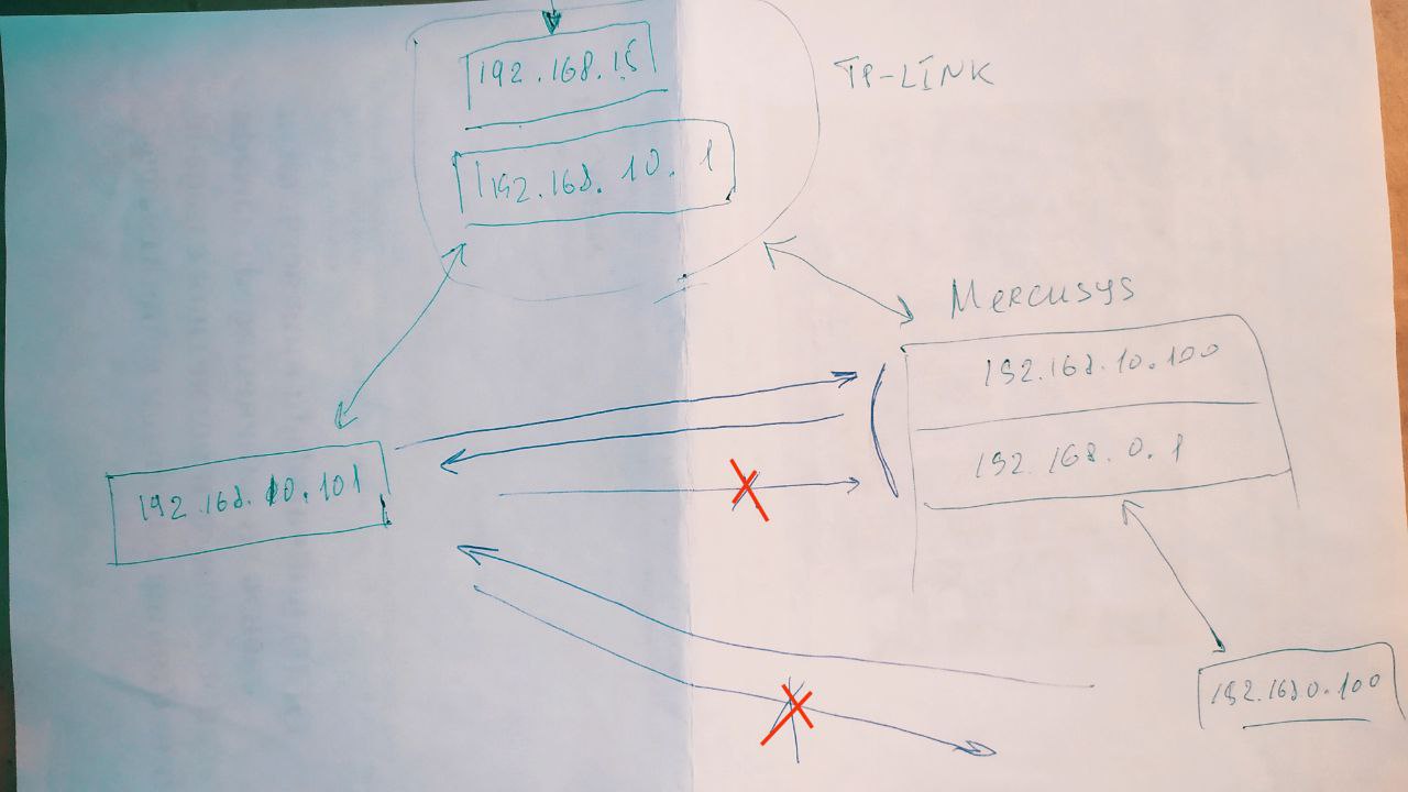 А у меня лыжи не едут с маршрутизацией между двумя двумя вайфаями... вайфай-роутерами.... задача - чтобы из подсетки одного пожно было связаться с подсеткой другого, т.к. один роутер не добивает... Так вот с одной подсетки пинг идет на другую, а в обратную сторону - не идет, хоть убейся