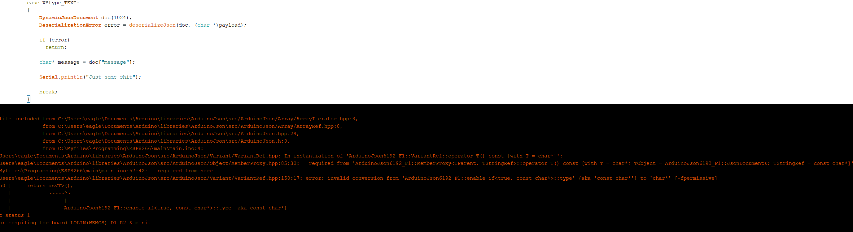 в функции void webSocketEvent(WStype_t type, uint8_t * payload, size_t length) пытаюсь десереализировать жсон таким образом: