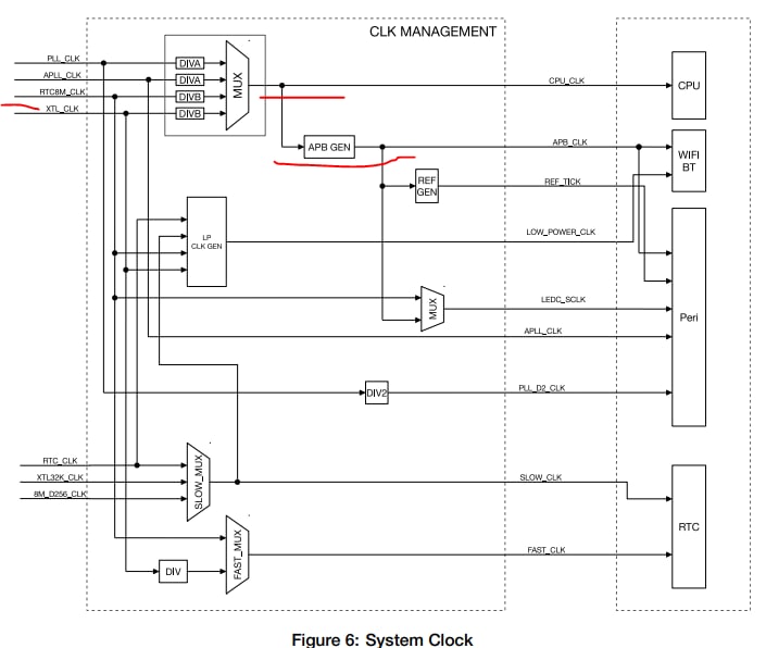 надо копать функцию rtc_clk_init в \components\esp_hw_support\port\esp32\rtc_clk_init.c