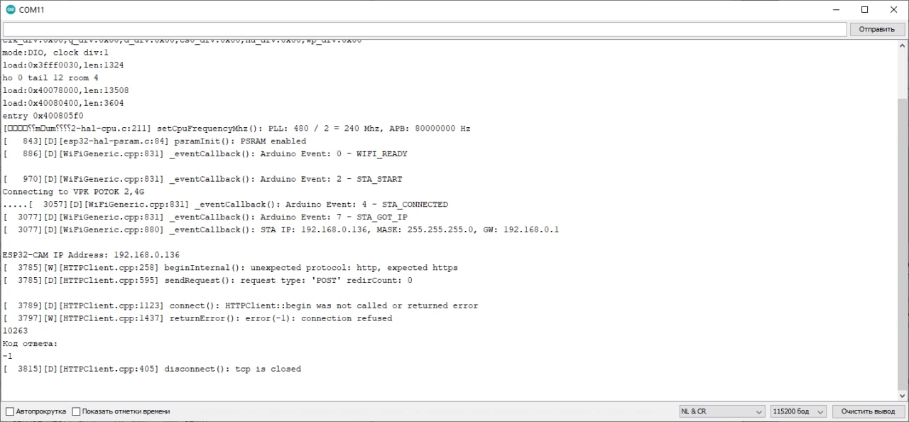 rst:0x1 (POWERON_RESET),boot:0x13 (SPI_FAST_FLASH_BOOT)configsip: 0, SPIWP:0xeeclk_drv:0x00,q_drv:0x00,d_drv:0x00,cs0_drv:0x00,hd_drv:0x00,wp_drv:0x00mode:DIO, clock div:1load:0x3fff0030,len:1324ho 0 tail 12 room 4load:0x40078000,len:13508load:0x40080400,len:3604entry 0x400805f0Connecting to VPK POTOK 2,4G.....ESP32-CAM IP Address: 192.168.0.13610793Код ответа:-1