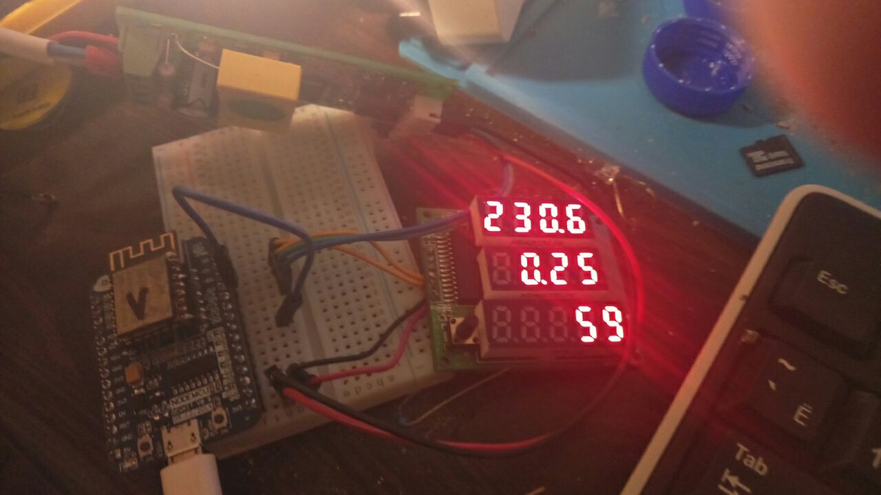 Наверху напряжение, второе - ток. Нижнее - текущая мощность, либо расход энергии