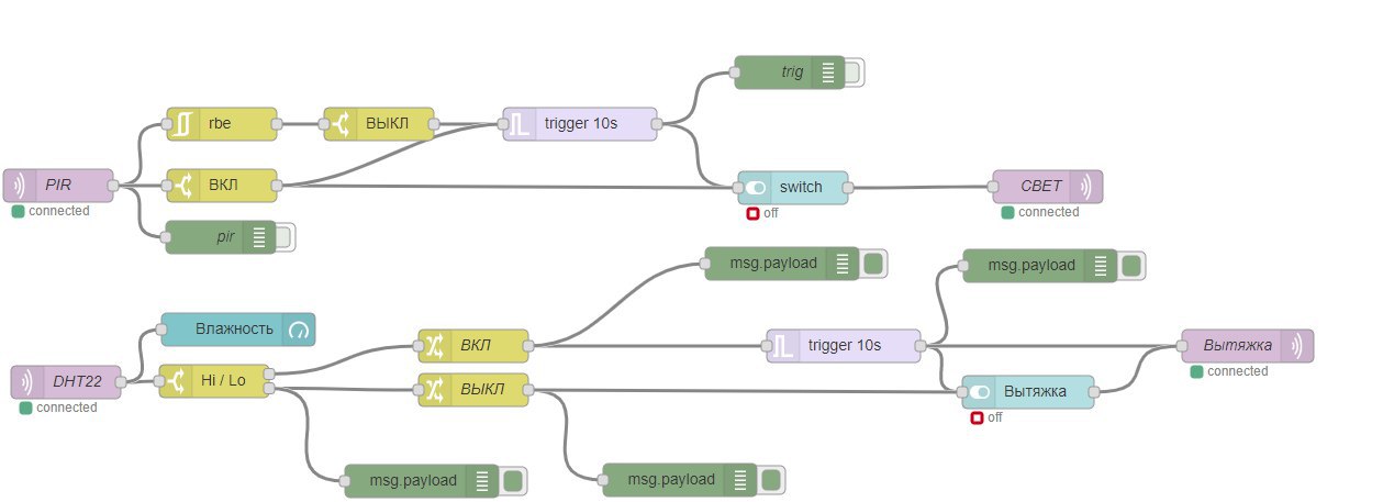 Подскажите пожалуйста,как в node-red сделать условие,что бы пока есть движение вытяжка не включалась?