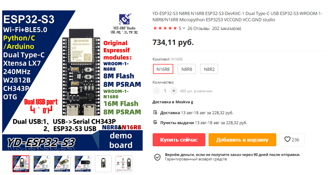 проще отдельно купить чипс S3 и к нему крутить, кстати производитель начал прямо поверх чипса внутри корпуса распаивать флеш и псрам, ESP32-S3FH4R2 = 4 флеша+2 псрам и ценник 250руб
