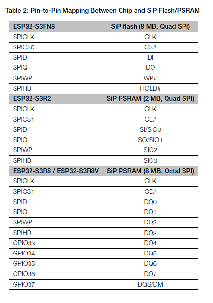 Octal SPI никто не применяет в модулях ESP32, а Quad SPI используют всегда 6 пинов, независимо от размеров SPI памяти.
