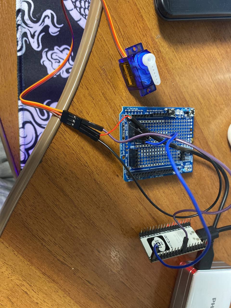 (На макетке три земли (есп, стороннее, сервопривод), 5В напрямую от БП, Логика к 17)