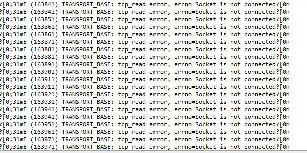 ?[0;31mE (265381) TRANSPORT_BASE: tcp_read error, errno=Socket is not connected?[0m