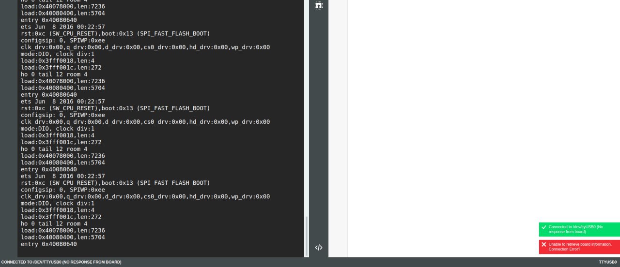Подскажите, подключил esp-wroom-32 после того как в espruino подключился то в консоли начали вываливаться сообщения без остановки и ошибка что нет ответа от платы , как решить это?