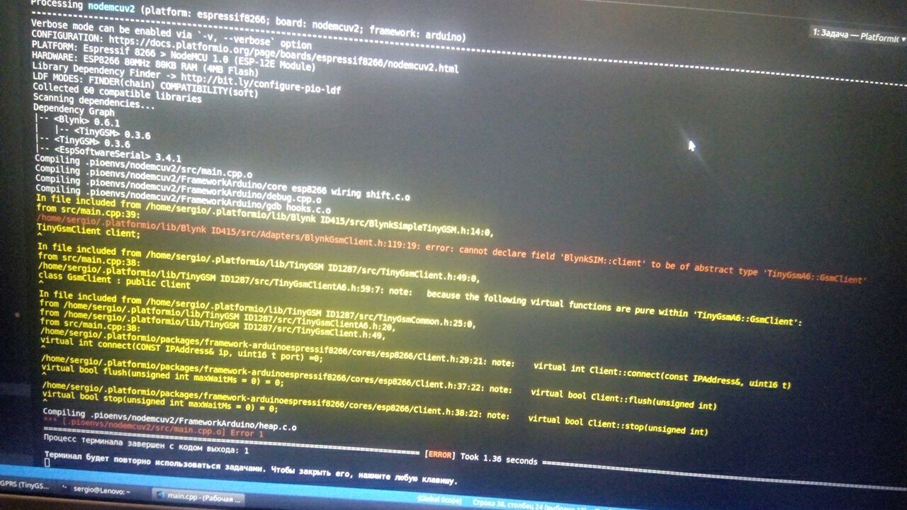 Подскажите как исправить ошибку компиляции кода с использованием библиотеки TinyGSM от автора проекта Blynk