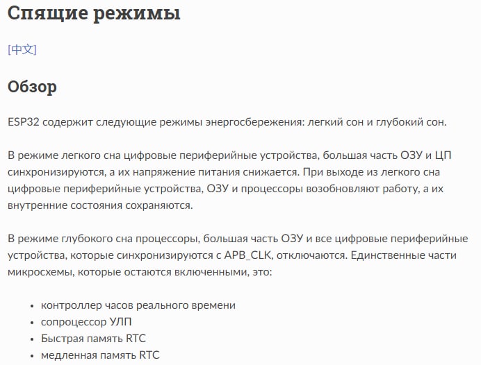 в гугле первая строчка есп режимы пониженного энергопотребления все расписано esp_sleep_enable_timer_wakeup(time_in_us);