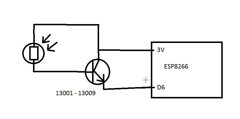 Всем доброго времени. Есть задача реализовать простую схему на esp8266 (node mcu): при освещение Фоторезистора (модель не известна - из какого-то набора arduino) необходимо на цифровом пине (например D6) получить логическую 1, при практически полной темноте 0. т.е измерять ни чего не нужно (не использую A0). Накидал схему: 3v из esp8266 на коллектор транзистора, эмитер транзистора на D6 (или другой цифровой пин), 3v на фоторезистор и базу транзистора. в качестве транзистора намерен использовать модели 13001-13009. есть ли какие-то ошибки и/или замечания к данной схеме ?