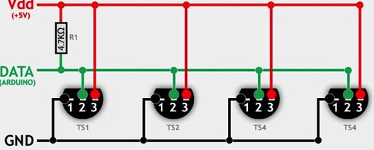 парни посоветуйте совет, я хочу воткнуть 4 датчика температуры ds18b20 на esp32, там получится гирлянда где нужно резистор воткнуть между питанием и датой.