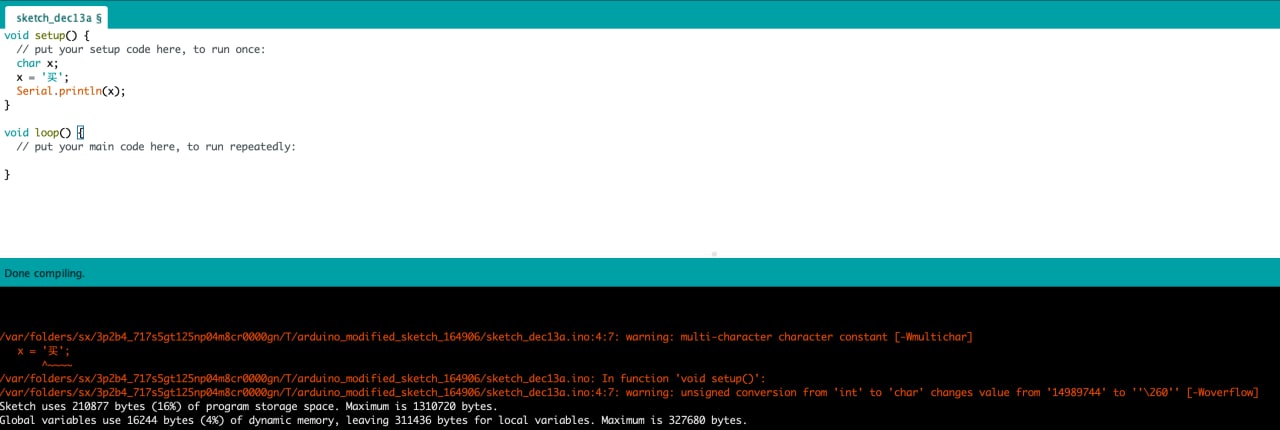 Ты же сам сказал что не читаешь предупреждения компилятора. А он тебе скорее всего говорил что то что ты присваиваешь txt[0] = '丘'; - занимает больше чем char и поэтому будет обрезано к хуям до char