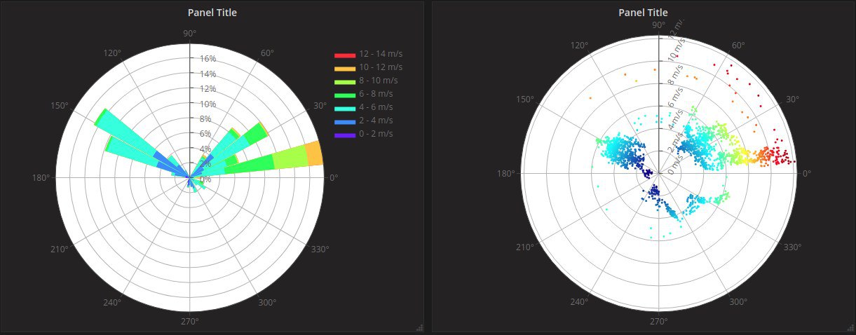 Кстати, вчера обнаружил что в графане есть готовая диаграмма для отображения розы ветров. Так что если кто-то у себя метеостанцию запилил, то гемор с визуализацией отпадает
